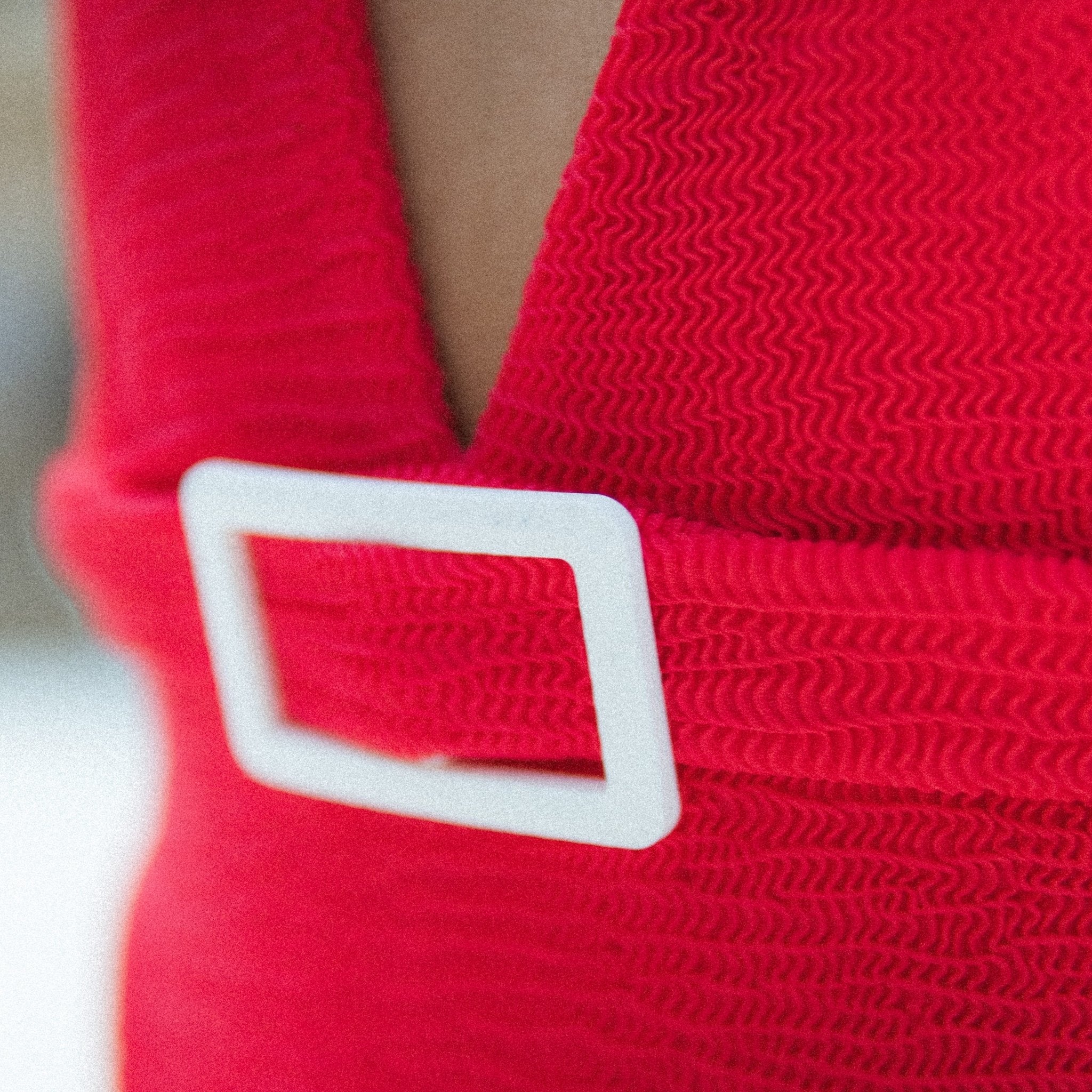 Melagrana Crinkle е модел с характер – съчетава изчистен силует с изразителен червен цвят и модерна crinkle текстура. Дълбокото V-образно деколте и широкият колан с катарама оформят талията и подчертават извивките, без излишна претенция.